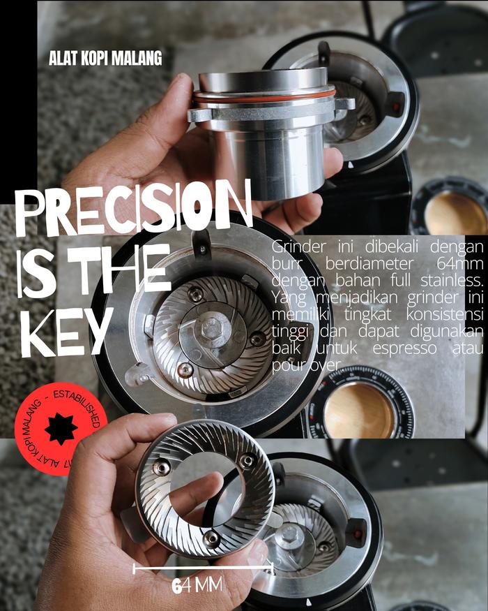 Grinder ini dibekali dengan burr Stainless berdiameter 64mm.