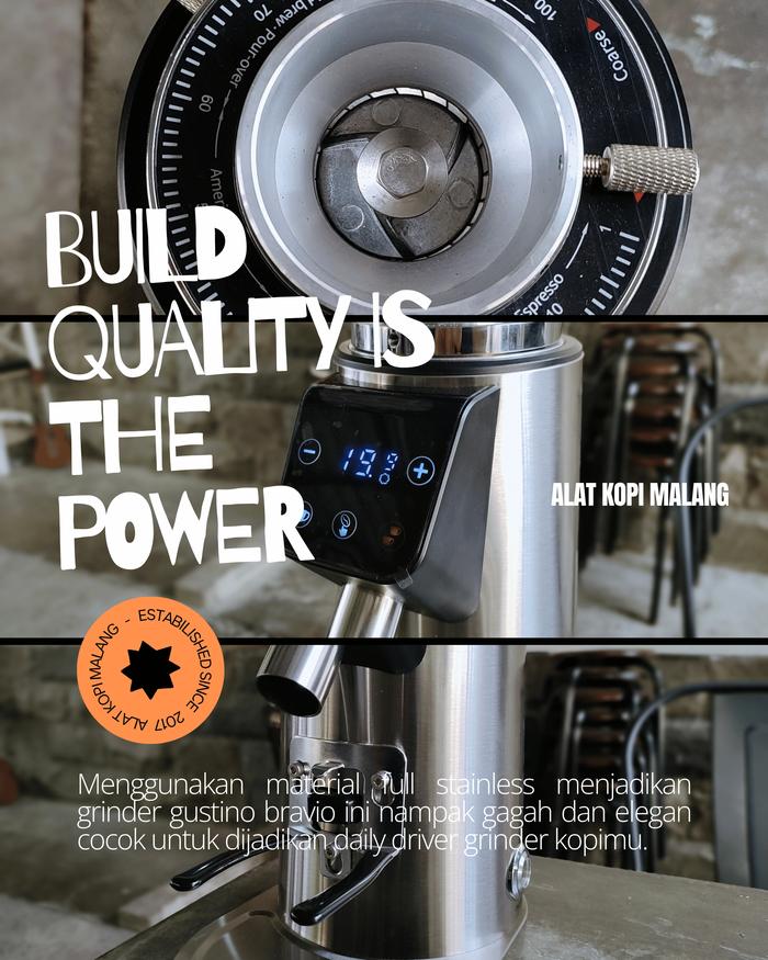 Menggunakan material gull stainless menjadikan grinder gustino bravio ini nampak gagah dan elegan, cocok untuk dijadikan daily grinder kopimu.